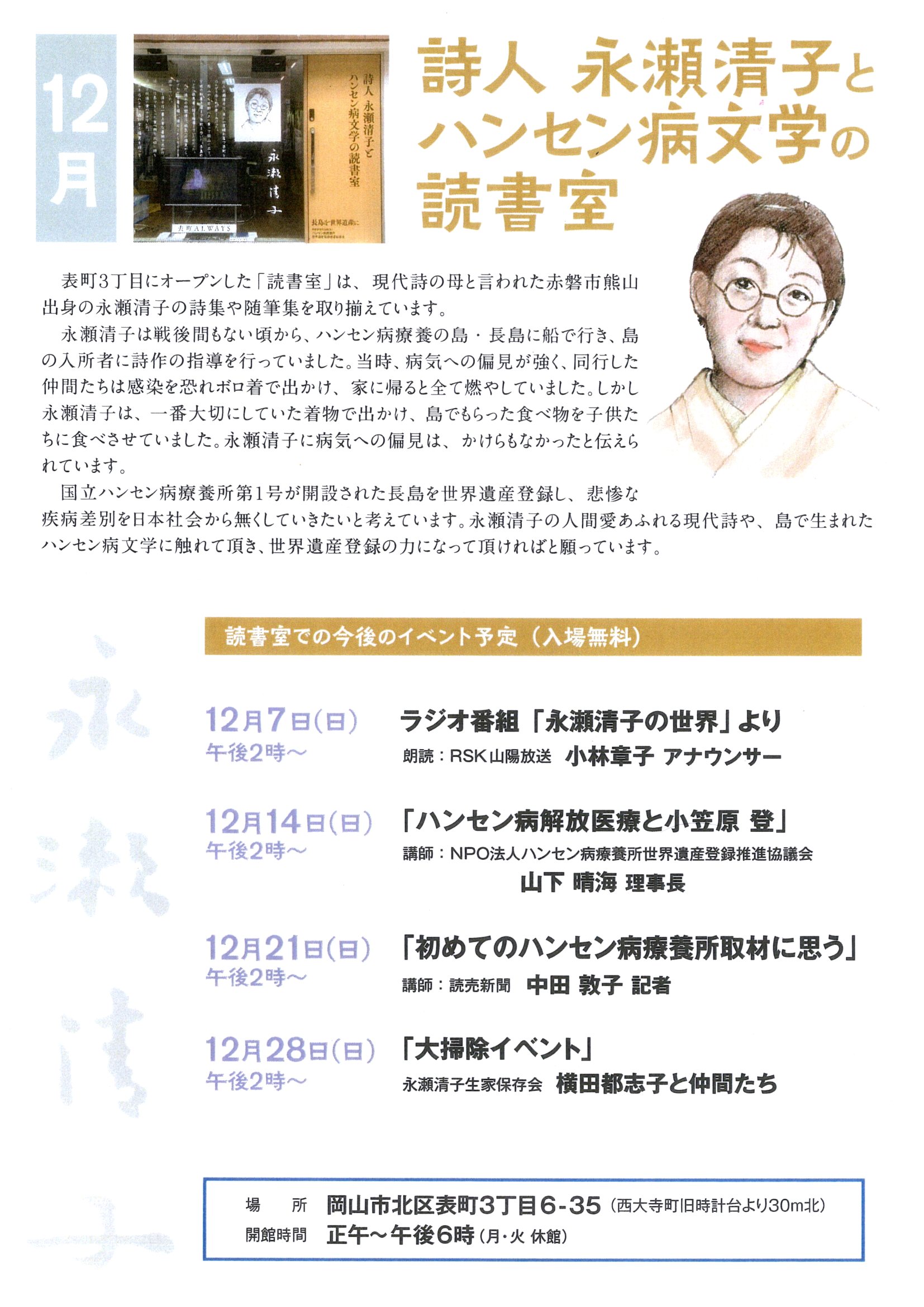 〈永瀬清子とハンセン病文学の読書室〉12月のイベントを公開しました。 2025年12月9日(火) Share facebook 読書室では毎週日曜日にさまざまなイベントをしています。 お気軽にお越しください。 ニュース一覧へ戻る